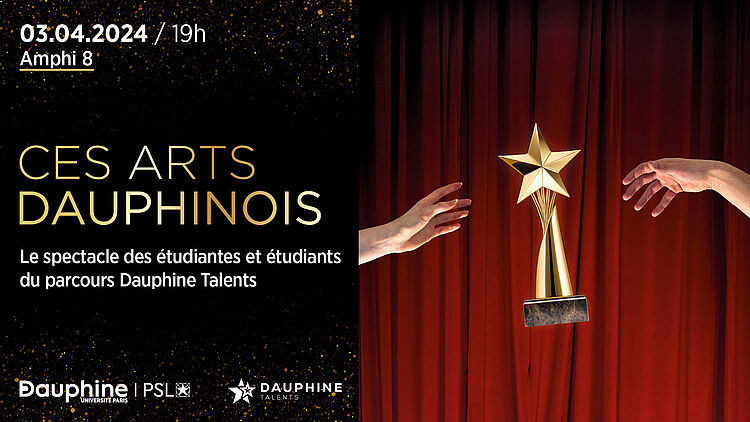 Musiciens, chanteurs, danseurs, comédiens... Retrouvez les étudiantes et étudiants de la Licence Dauphine Talents dans un spectacle d'exception mercredi 3 avril 2024 à l'Université Paris Dauphine - PSL (Amphithéâtre 8 - Edgar Faure, 2e étage) sur le thème de “Ces Arts Dauphinois”.