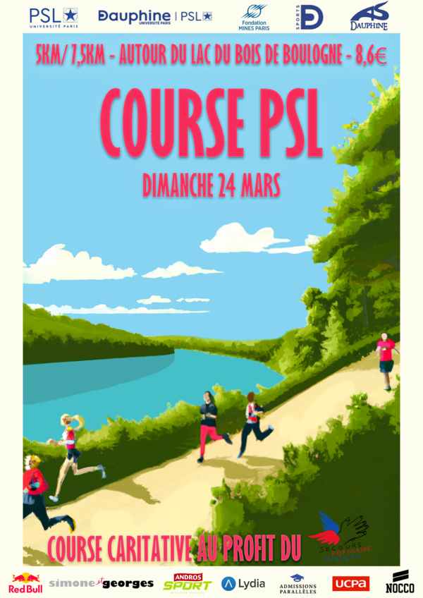 L’Association sportive Dauphine est honorée d’organiser la Course PSL 2024 au profit du Secours Populaire et plus particulièrement pour les Copains du Monde, à qui les bénéfices de l’événement seront reversés intégralement. Elle se déroulera le dimanche 24 mars 2024, autour du lac inférieur du Bois de Boulogne où vous pourrez échanger avec les bénévoles de l’association et le groupe interuniversitaire PSL.
