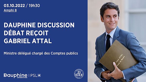 À l'occasion de son débat de rentrée, l'association Dauphine Discussion Débat a le plaisir de recevoir Gabriel Attal, Ministre délégué chargé des Comptes publics et ancien porte-parole du gouvernement, le lundi 3 octobre 2022 en Amphithéâtre Edgar Faure (Amphi 8).