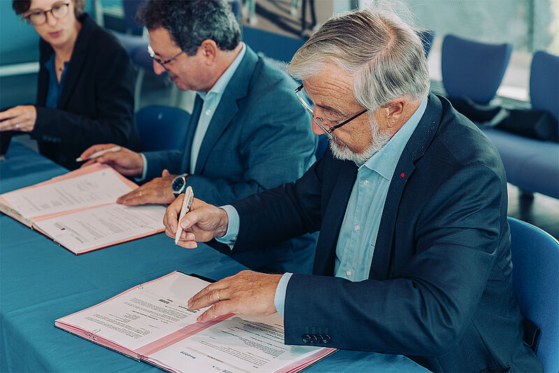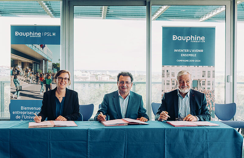 La signature a été officialisée ce mois de septembre 2023 par Anne-Sophie Chauveau-Galas, Directrice des Ressources Humaines, Groupe Société Générale, El Mouhoub Mouhoud, Président de l'Université Paris Dauphine - PSL et Vincent Montagne, Président de la Fondation Dauphine.