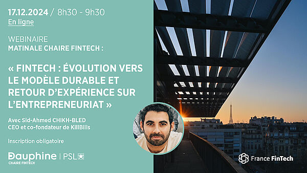 Le mardi 17 décembre 2024 à 8h30, la Chaire Fintech, et ses partenaires Forvis Mazars et Crédit Agricole CIB, ont eu le plaisir d'accueillir en collaboration avec France Fintech, Sid-Ahmed Chikh-Bled, CEO et co-fondateur de KillBills pour un webinaire sur "la Fintech : évolution vers le modèle durable et retour d'expérience sur l'entrepreneuriat".