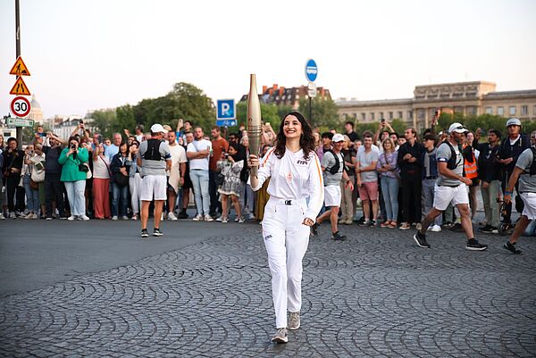 Le 14 juillet, c'est au tour de Camille Pigois, étudiante de l'IPJ Dauphine - PSL en Master 1 Journalisme, bénévole de l'association Repairs 75 et représentante de la Ville de Paris au Conseil d'Administration du CIDJ / Protection de l'enfance, de porter la flamme olympique à Paris, devant le Quartier Jeunes.