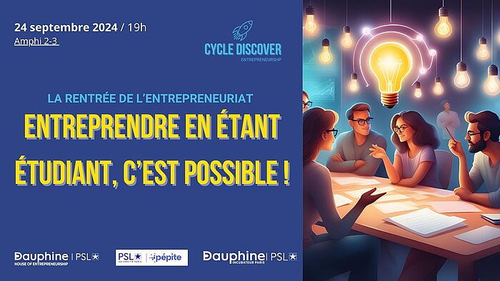 Nous vous donnons rendez-vous mardi 24 septembre pour notre première soirée de rentrée : « La rentrée de l’entrepreneuriat - Entreprendre en étant étudiant, c’est possible ! » avec l’incubateur et PSL Pépite.