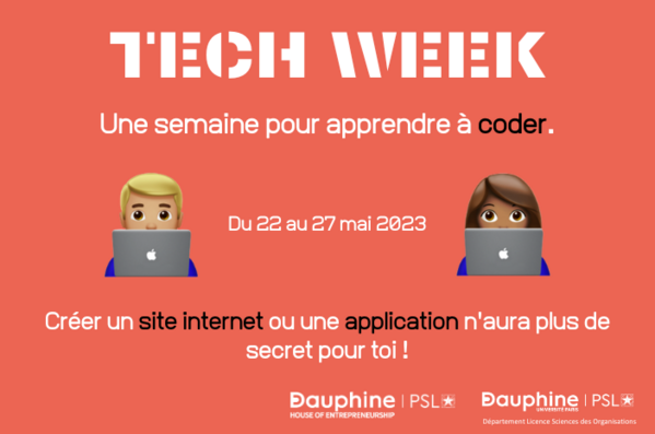 Apprendre à coder en une semaine : le pari peut sembler un brin ambitieux, et pourtant ! C'est l'objectif de la TechWeek, organisée par le Département Licence Sciences des Organisations de Dauphine et la House of Entrepreneurship, qui aura lieu cette année du 22 au 27 mai 2023.
