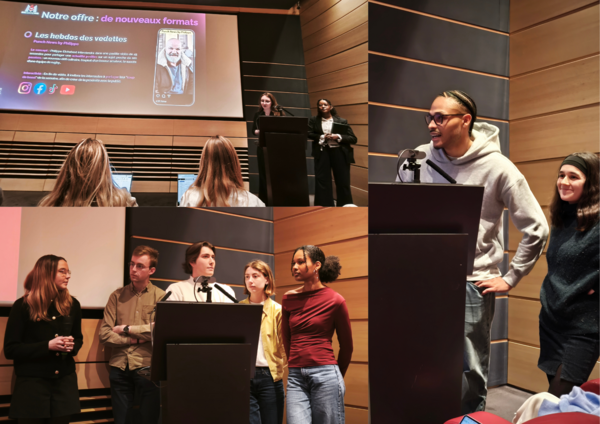 Après une semaine de travail à l’IPJ, les étudiants ont combiné, lors de soutenance dans les locaux de M6, créativité, dynamisme et réflexion stratégique pour présenter des solutions innovantes devant un jury composé des deux responsables des masters, Henri Isaac pour Média et Télécom et Pascal Guénée pour l’IPJ Dauphine, ainsi que de la direction du média, Alix de Goldschmidt (Innovation, Data & AI), Sarah Ouaki (Régie), Clara Desgrand (Stratégie), Nicolas Mallot, Pascal Melkonian (M6 Info) et Cyprien Cini (RTL).