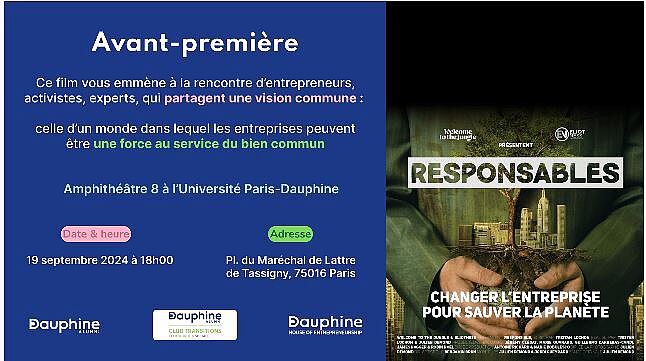 Venez découvrir en avant-première, la projection du film "Responsables", réalisé par Tristan Lochon et Julien Demond de Welcome to the Jungle, co-organisée avec le Club Transitions écologique & sociale de Dauphine Alumni.