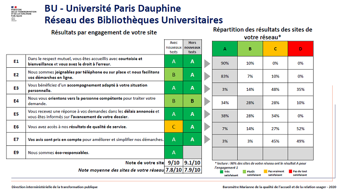 Dans ce cadre, des administrations sont testées chaque année par le Baromètre Marianne. 29 bibliothèques universitaires, dont celle de l'Université Paris Dauphine-PSL, sont ainsi interrogées par des enquêteurs mystères à travers des courriels, des appels et des visites et un audit de leur site Internet. L’objectif est de voir si les services répondent bien aux attentes du référentiel Marianne et aujourd’hui des engagements Services Publics +.