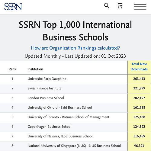 Au 1er octobre 2023, l’Université Paris Dauphine – PSL se classe première « Business School » à l'international (hors Etats-Unis) pour le nombre de publications téléchargées produites en son sein depuis le début de l'année.