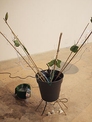 Pot, tuteurs, LED, pompe à eau, cuvette, sèche-cheveux, rubans, feuilles, piles. 1,5x1,5x1,7m.