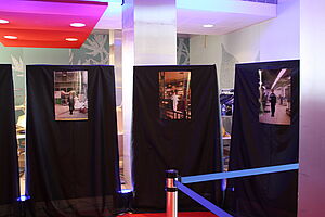 Photos numériques, spots lumineux, moquette rouge, panneaux en bois, tissu.