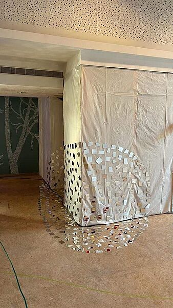 Ces fragments de miroir, tels qu’ils sont disposés, font un parallèle avec le questionnement de l’auditeur cherchant à former un sens entre des tâches dissociées qui l’interrogent sur sa propre légitimité.