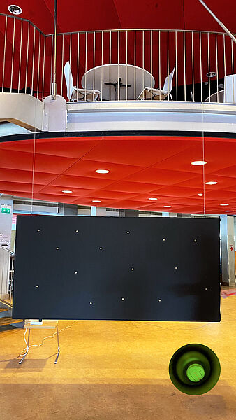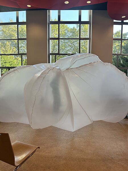 Cette œuvre représente l’environnement de l’auditeur, une structure énorme, fragile qui tient grâce à un mince filet d’air. Si ce souffle s’arrête, tout s’écroule, alors l’auditeur sera-t-il encore capable de bien faire son travail ?