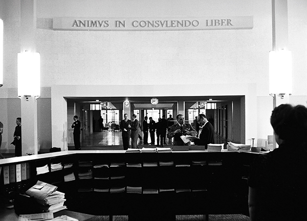 Le Président américain, en visite d’État pour rencontrer le Général de Gaulle, se rend dans la salle de l’assemblée plénière de l’OTAN, qui deviendra l’amphithéâtre Edgar Faure de l’université.