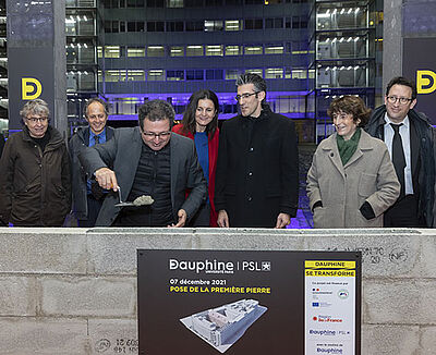 Ce 7 décembre 2021 a eu lieu la pose de la première pierre du projet de restructuration du campus de l’université Paris Dauphine-PSL.