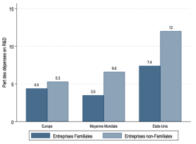 Les études référencées dans le tableau ci-dessous montrent que les entreprises familiales dépensent en moyenne moins en recherche et développement (R&D) que leurs homologues non familiales. Cet écart est particulièrement marqué aux États-Unis, mais moins prononcé en Europe (Figure 1).