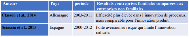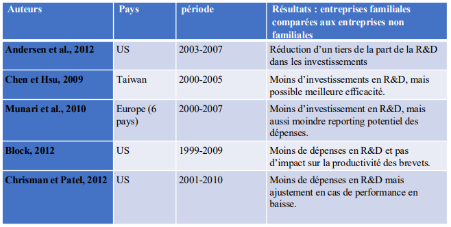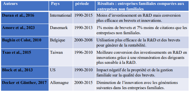 Les entreprises familiales investissent généralement moins en R&D que leurs homologues non familiales, mais leur efficacité en innovation reste un sujet débattu. Certaines études montrent qu’elles optimisent mieux ces investissements en convertissant des ressources limitées en résultats plus efficaces, avec une productivité plus élevée des brevets et une meilleure transformation de la R&D en innovations commercialisables. Mais d’autres études au contraire trouvent une moindre efficacité de l’innovation (voir les résultats dans le tableau ci-dessous).