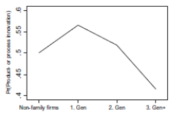 La figure ci-dessous, tirée de Werner et al (2018) illustre les résultats d’une vaste enquête menée auprès de PME allemandes. Elle mesure la probabilité d’une innovation produit ou process au cours des trois dernières années, et montre que si les entreprises familiales de première génération sont plus innovantes que les entreprises non familiales, les générations suivantes sont en moyenne moins innovantes que les entreprises non familiales. Cet effet est particulièrement notable pour les petites entreprises. Decker et Günther (2017) confirment ces résultats.
