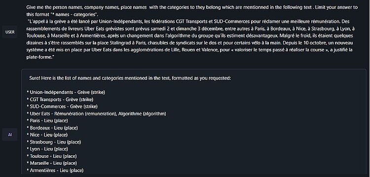Avec les IAGs cette tâche est grandement simplifiée : un prompt bien conçu permet de réaliser cette tâche sans passer par l’épreuve d'entraînement. L’image ci-après représente le résultat de cette opération sur un fragment d’un article récent du monde, avec le modèle Llama 2 13 GB Q5, installé localement.
