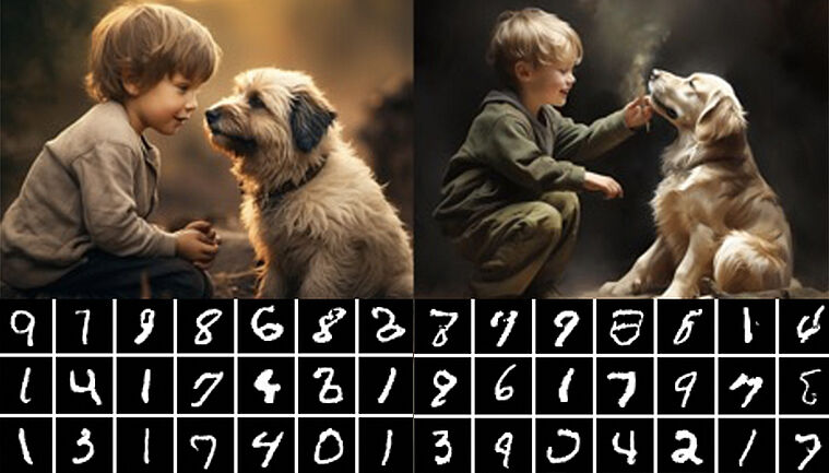 - D’un autre côté, Mid Journey, modèle concurrent, s’avère capable de produire des images sans défauts visuels (ou artefacts), ni incohérences, donc nettement plus convaincantes et de meilleure qualité. Cependant, ces images plus réalistes sont en même temps souvent plus uniformes, représentant fréquemment des petits garçons aux cheveux châtains face à un chien de couleur claire, dans des situations similaires. Ces exemples illustrent les extrêmes du compromis entre qualité et diversité offerts par ces modèles d'IA générative.