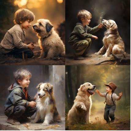 D’un côte, Dall-E2 produit une large gamme d'images, offrant une variété de scénarios, de différents chiens, de garçons ou de filles de divers âges.