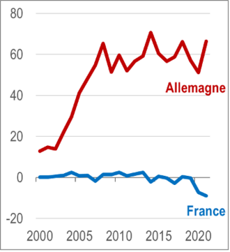 Par contraste, l’Allemagne est l’un des trois leaders mondiaux après les Etats-Unis et la Chine en 2021. Elle réalise des excédents conséquents pour ces produits à fort potentiel. Ainsi, la France, qui a pourtant des atouts historiques dans le domaine de la santé, perd de plus en plus de terrain, notamment face à l’Allemagne qui a davantage misé sur une stratégie de filière.