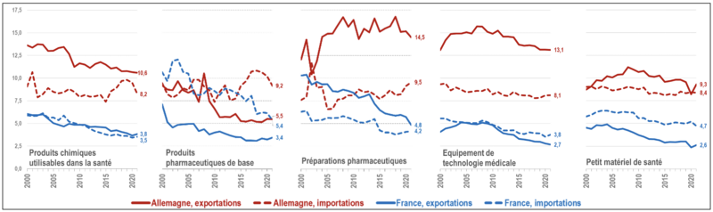 L’Allemagne détient environ 12% des parts de marché à l’exportation dans la filière de santé, un niveau stable depuis 2000, tandis que la part de la France baisse constamment, passant de 6,3 à 3,7%. En 2021, l’Allemagne est le deuxième exportateur mondial après la Chine ; la France est au 8ème rang. Les produits de santé ne représentent plus un avantage comparatif pour la France5.