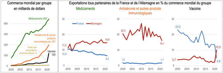 Le fossé franco-allemand est bien plus impressionnant dans les « antisérums & autres produits immunologiques » (comme les anticorps monoclonaux), pour lesquels le commerce est de plus en plus dynamique. Plus du quart du commerce mondial des préparations pharmaceutiques (26 %) relève en 2021 de cette catégorie, part en hausse d’environ 20 points depuis 2000. Les exportations allemandes y correspondent à 16 % des exportations mondiales contre moins de 2 % pour celles de la France.