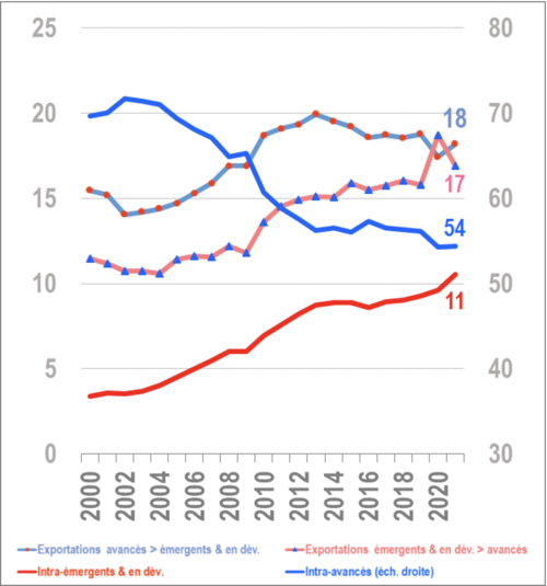 Mais ce commerce intra-zone est marqué par un déclin relatif depuis les années 2000 (-16 points de pourcentage) tandis qu’augmentent les exportations des pays avancés vers les pays émergents et en développement. Ces derniers montent en puissance, essentiellement pour les produits bas de gamme, à la fois dans leurs exportations vers les pays avancés et leurs échanges mutuels.
