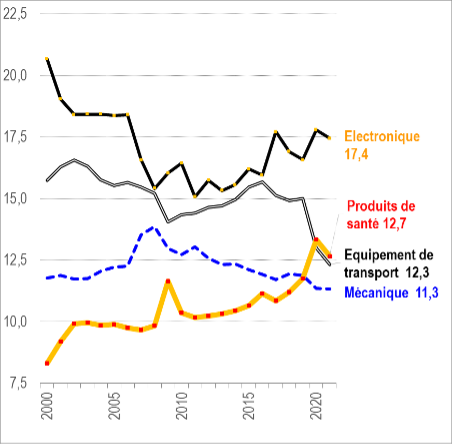 (hors énergie, 2000-21, en % des exportations mondiales de la filière)