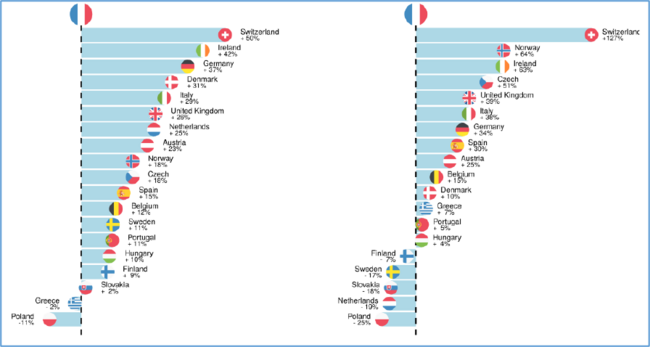 Graphique N°3. Comparaison du prix des médicaments en Europe aux prix français pour les médicaments sous brevet (à gauche) et ayant perdu leur brevet (à droite)