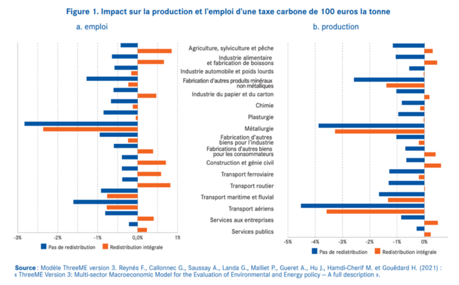 Par exemple, une taxe carbone de 100 €/tonne entraînerait, après 10 ans, des variations d’emploi modérées par secteur (entre -2 % et +1 %), avec des effets atténués si les recettes de la taxe sont redistribuées aux ménages et aux entreprises (voir Figure). Pour atteindre la neutralité carbone en 2050, le prix du carbone devra être bien plus élevé (jusqu’à 860 €/tonne en 2050), ce qui amplifierait les réallocations.