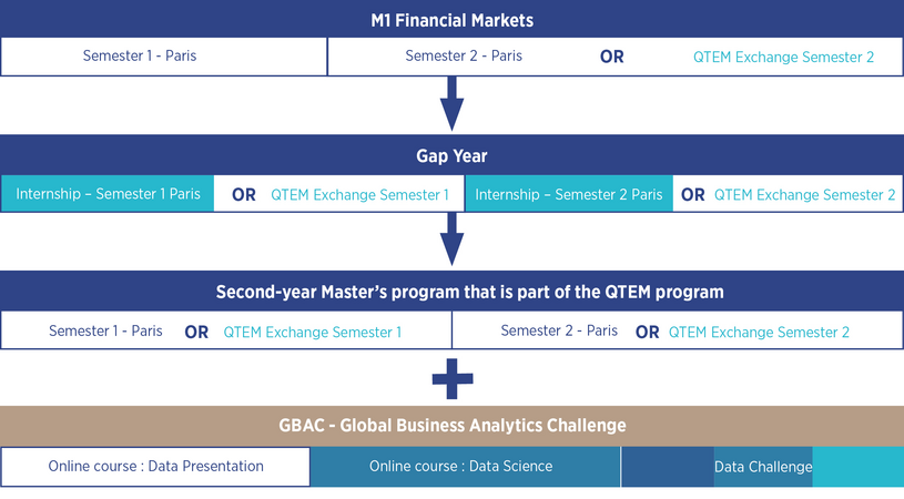 Suivre le parcours QTEM pendant le M1 Financial Markets ou lors d'une année de césure après le M1 est considéré comme un avantage pour l'admission des M2 participants à QTEM. Les candidats désireux de participer au programme QTEM en M1 Financial Markets doivent obligatoirement poursuivre leurs études au sein d’un M2 inclut dans le programme :