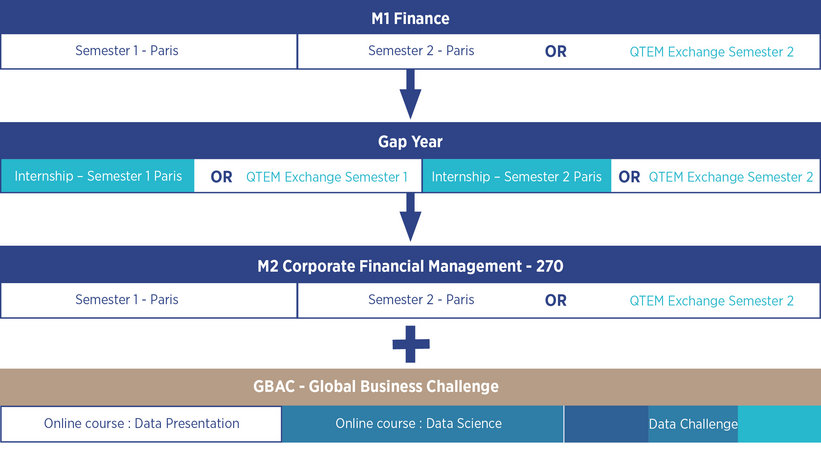 Suivre le parcours QTEM pendant le M1 Finance ou lors d'une année de césure après le M1 est considéré comme un avantage pour l'admission au Master Management financier de l'entreprise - 270. Pour les candidats n'ayant pas eu cette possibilité avant d'intégrer le master, il est possible de suivre le parcours QTEM au cours du semestre 2.