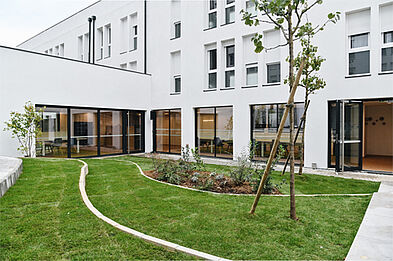 Services disponibles dans la résidence : laverie, espace lounge, jardin, local à vélo, distributeurs automatiques de boissons et de petite restauration.